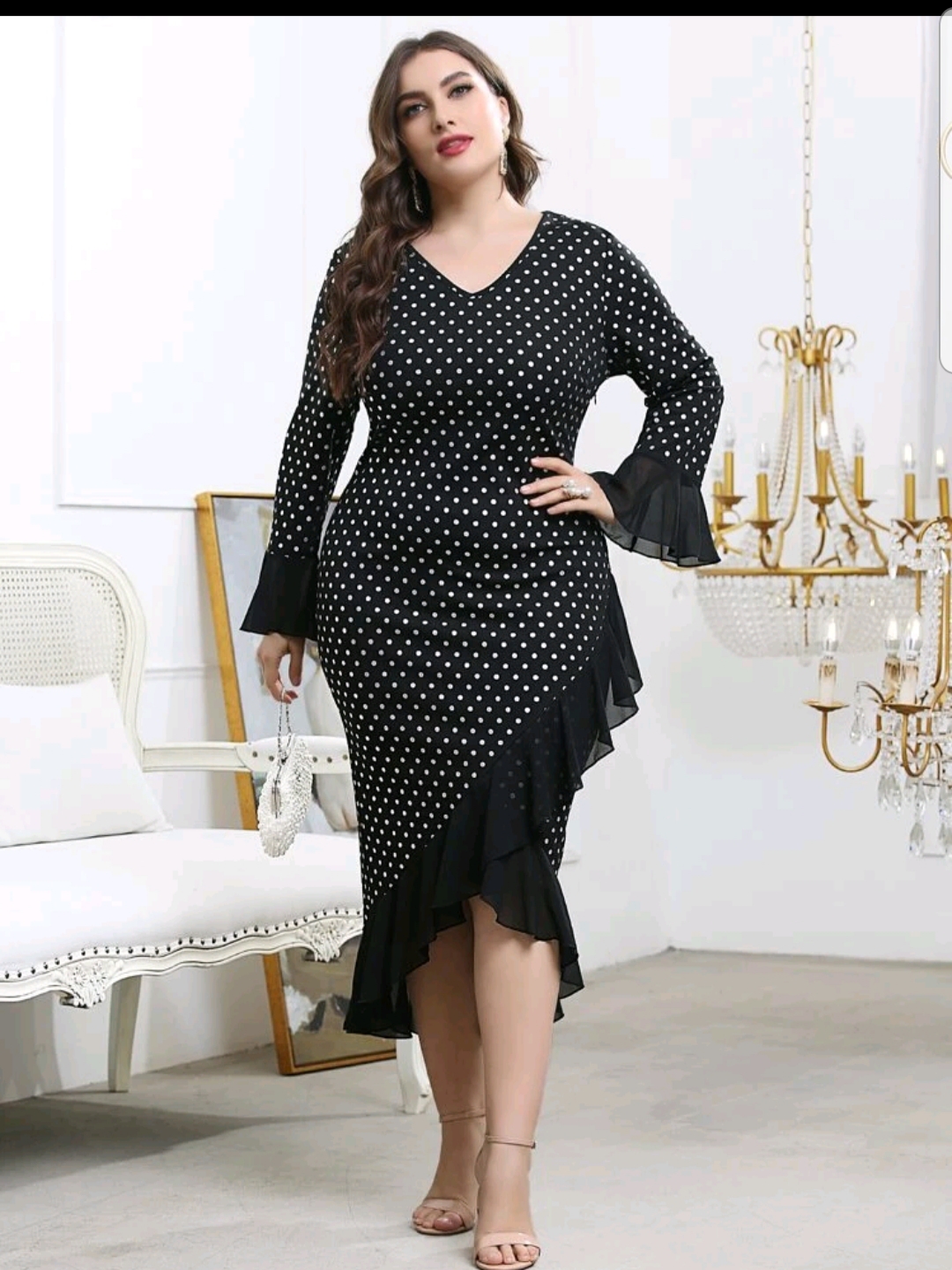 V-Neck Ruffle hem Polka dot dress