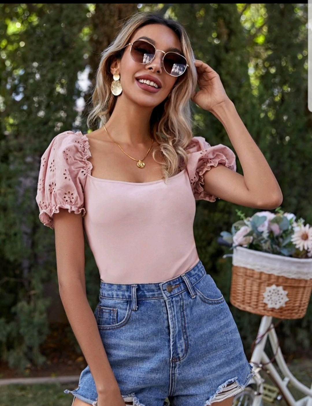 Eyelet Embroidered Puff Sleeve Tee