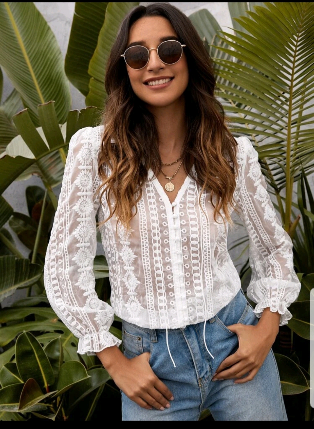 Lace sheer Flounce sleeve blouse